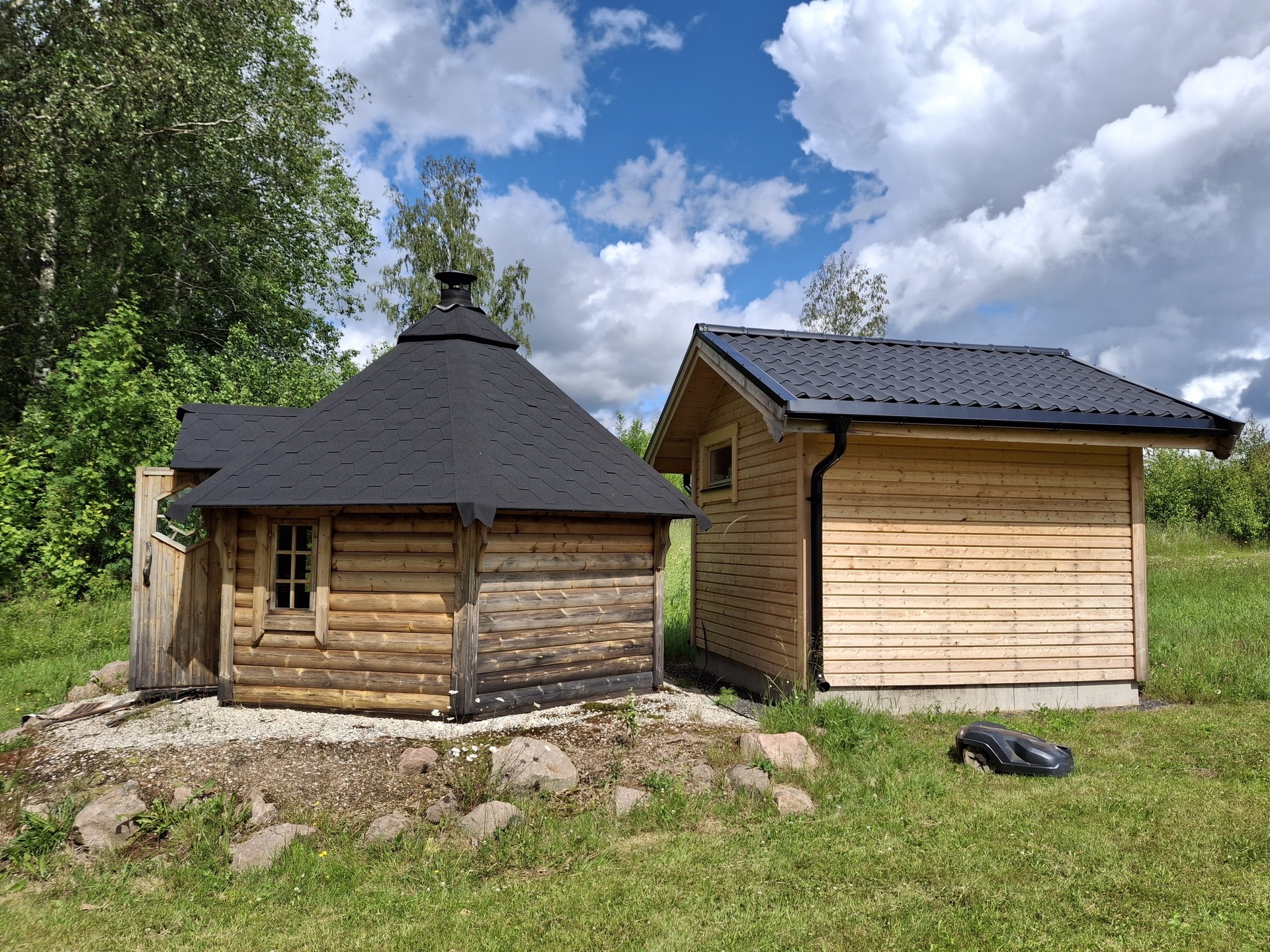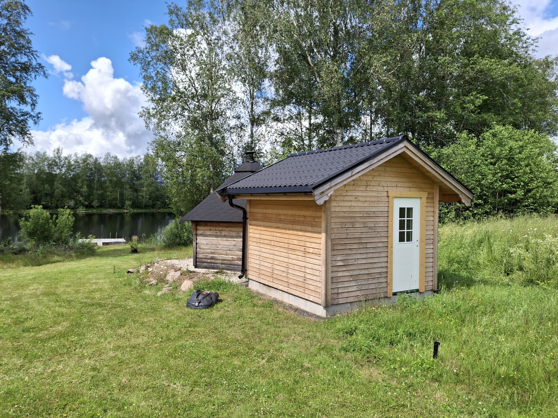 Byggd på 30 cm singelbädd i liggande panel och shingeltak.