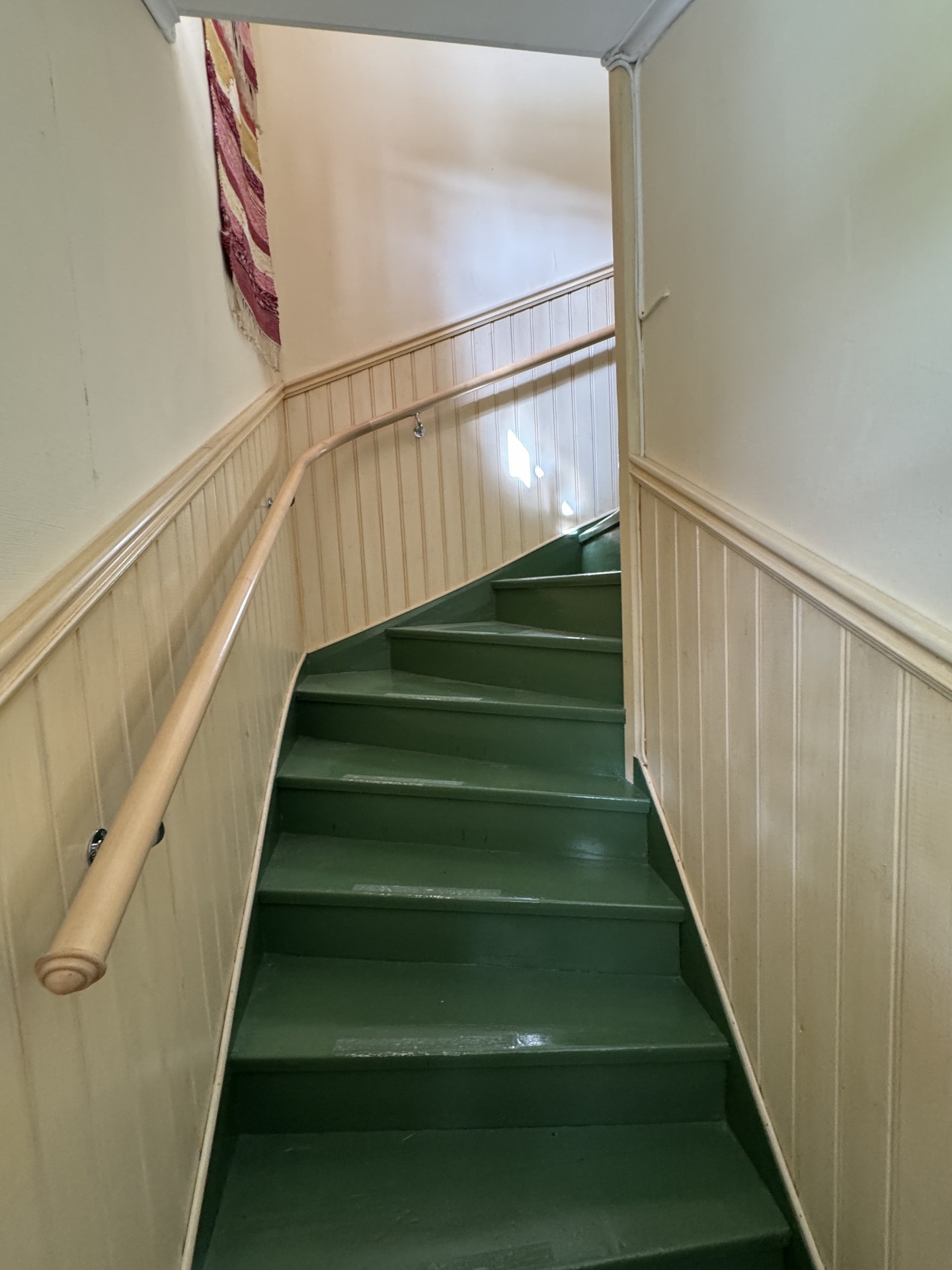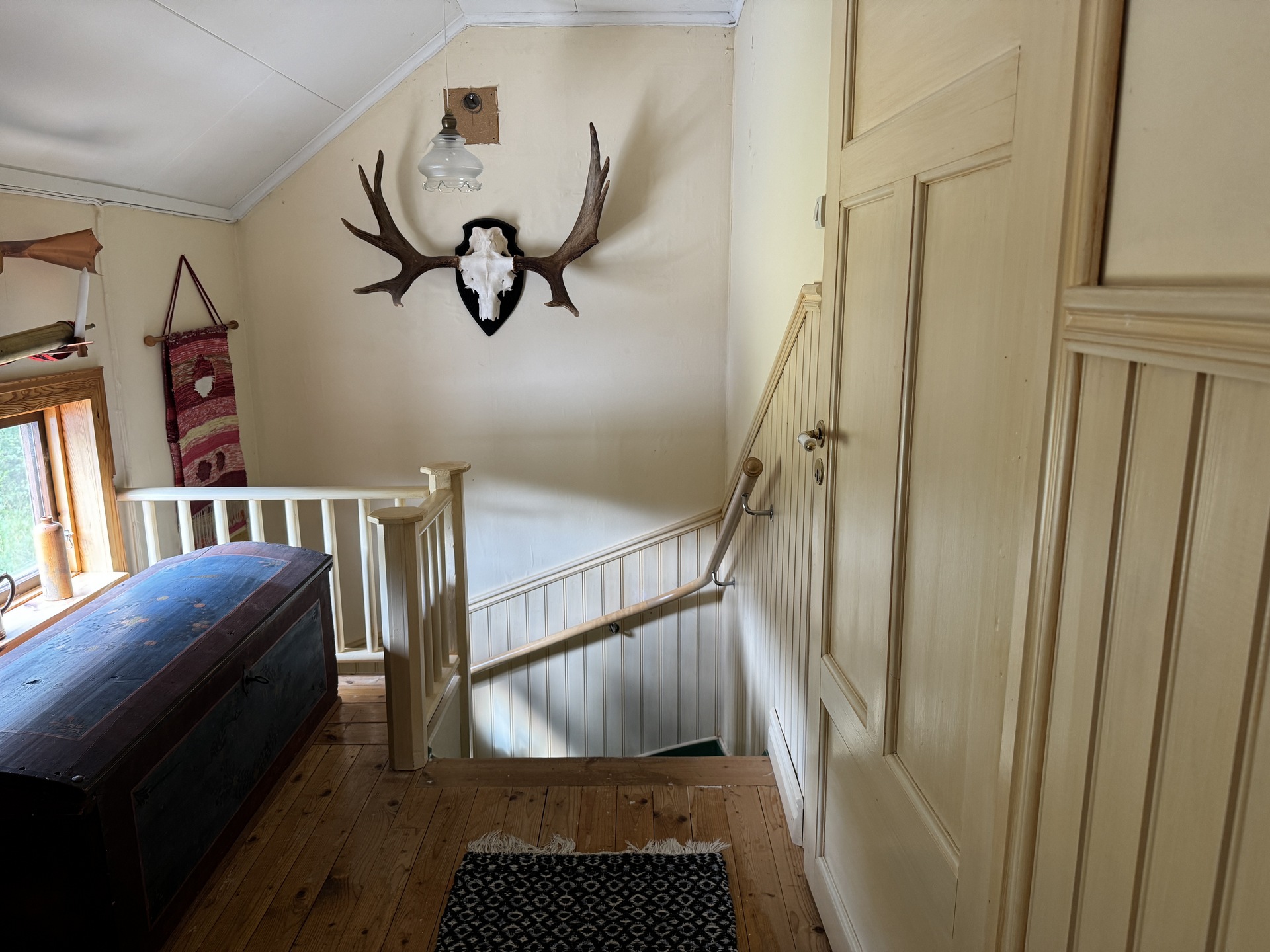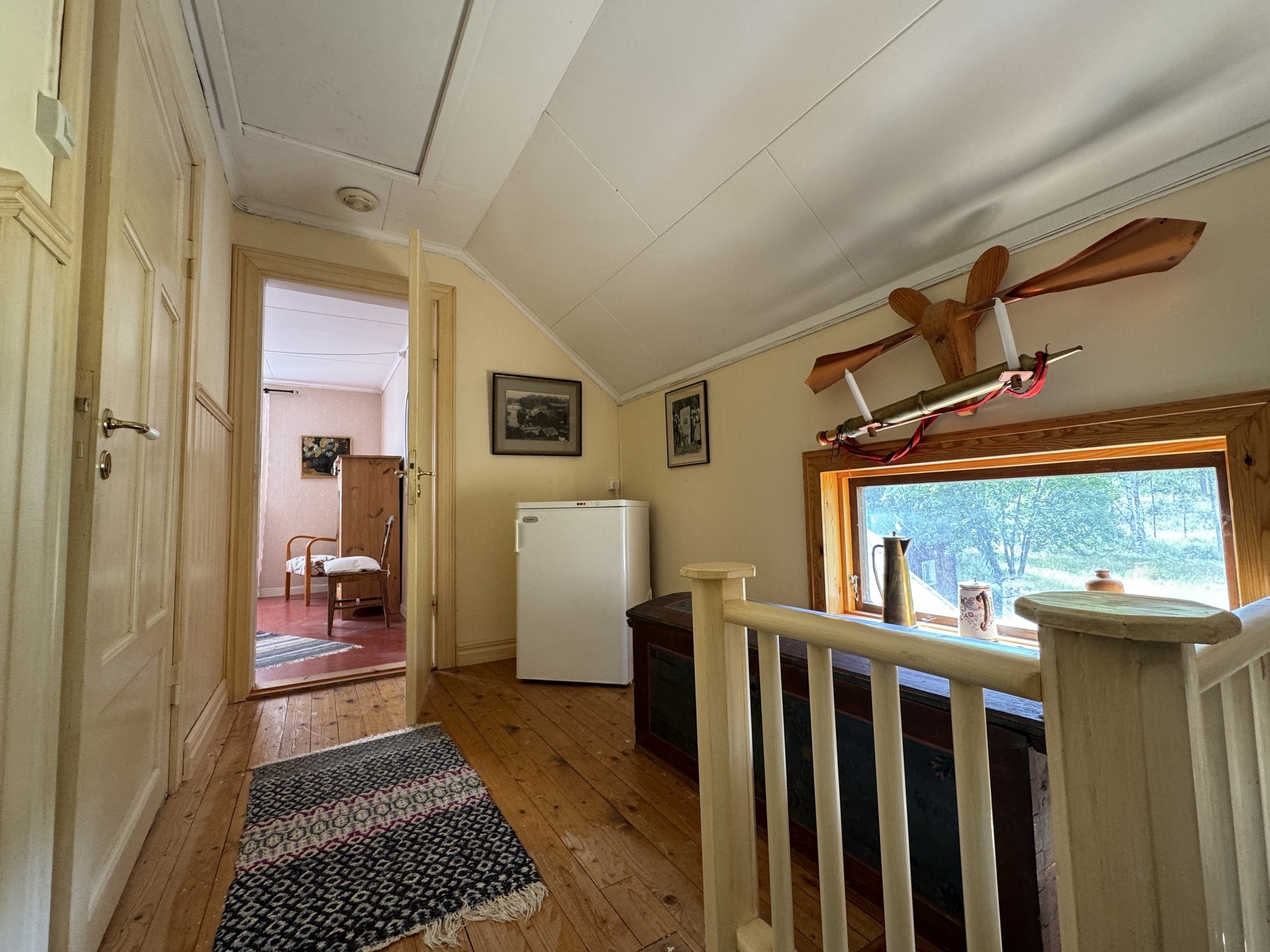 På nedre plan finner man hall, kök samt vardagsrum och badrum. Hallen är välkomnande och har bröstpanel samt tapet på vägg, skivor i taket och trägolv. Köket är hemtrevligt med stark retrokänsla i de ursprungliga köksinredningen och detaljerna. Det är utrustat med halvt kylskåp, 4-plattors elspis samt kökspanna. Kaklat över diskbänk och spis samt ett stort skafferi man kan gå in i. Trägolv, målad masonit på vägg och i tak. Vardagsrummet är litet men mysigt. Trägolv, tapet och skivor i taket. På övre plan finns två sovrum samt mindre, lätt möblerbar hall. Bröstpanelen fortsätter upp i trappen mot övervåningens hall, trappen är läckert grönmålad. Hallen har ett långsmalt, liggande fönster som ger fint ljusinsläpp, här finns inspektionslucka till vinden. Trägolv, tapet och skivor i taket. Sovrum ett, till vänster från hallen har snedtak på ena sidan, trägolv, tapet och skivor i taket. Sovrum två, rakt fram från hallen har snedtak på ena sidan, plastmatta, tapet och skivor i taket.