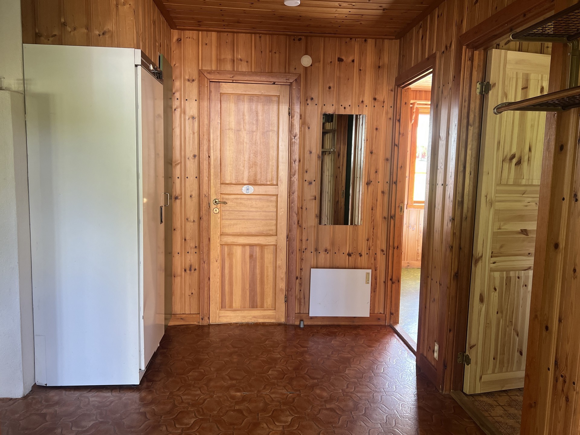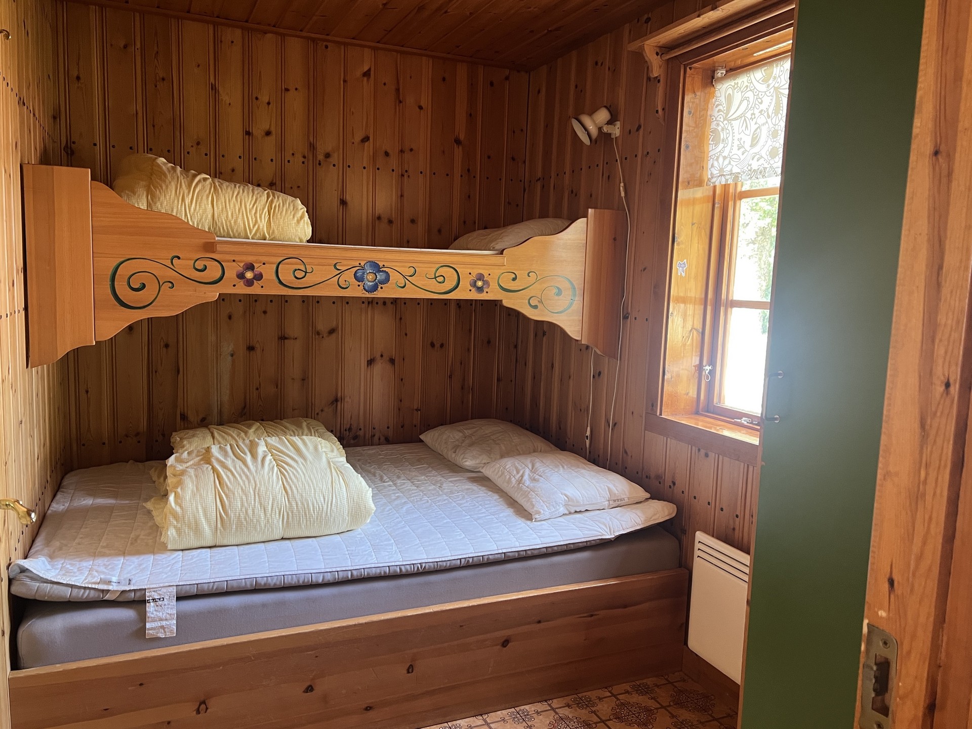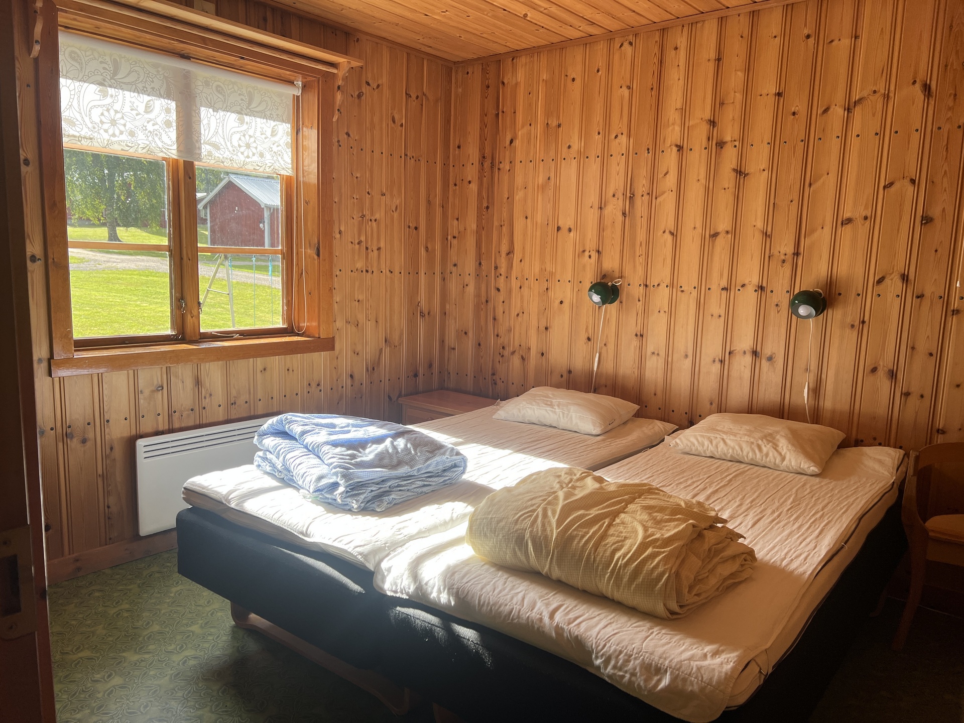 Huset omfattar hall, storstuga med köksavdelning, två sovrum samt badrum. Genomgående plastmatta på golv och träpanel på väggar och i tak. Hallen har gott om plats för avhängning av kläder. Här finns torkskåp samt städskåp. Storstugan har fint ljusinsläpp från tre fönster och en öppen spis. Köket är idag inrett med vita skåpluckor och väggplatta ovanför köksbänken. Köksavdelningen består av inbyggd spis med häll av märket Ignis, fläkt samt en inbyggd kyl med liten frys, enkel rostfri diskho samt en diskmaskin. Badrummet är inrett med WC, handfat, dusch med draperi samt varmvattenberedare och har våtrumsmatta på golv och väggar, panel i taket samt öppningsbart fönster . Stora sovrummet har plats för dubbelsäng och det finns en inbyggd dubbelgarderob. Lilla sovrummet har platsbyggd våningssäng, en dubbel och en enkelsäng samt en garderob.