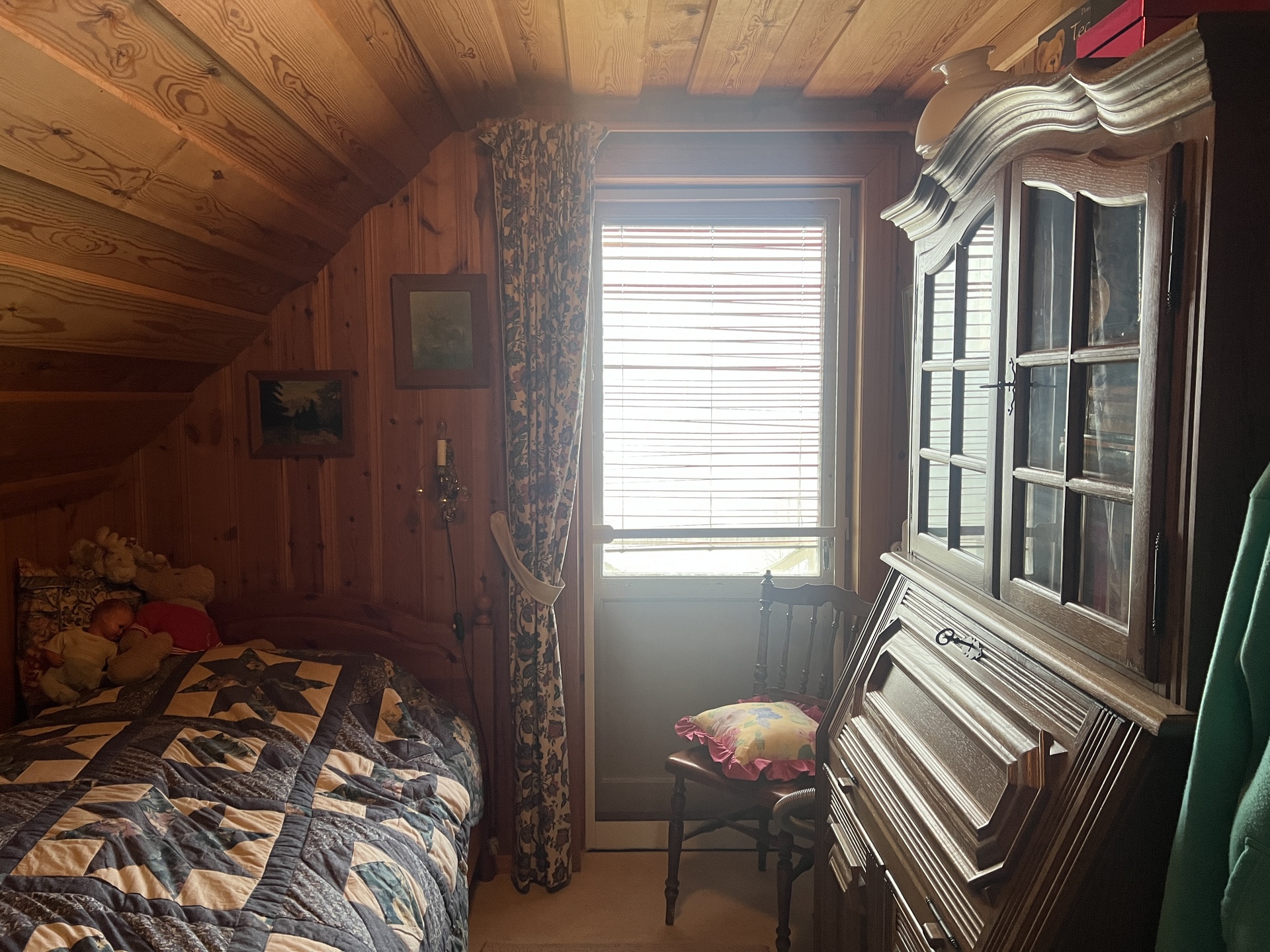 Sovrum 1: Plastmatta, panel väggar och i taket, snedtak, utgång till balkong