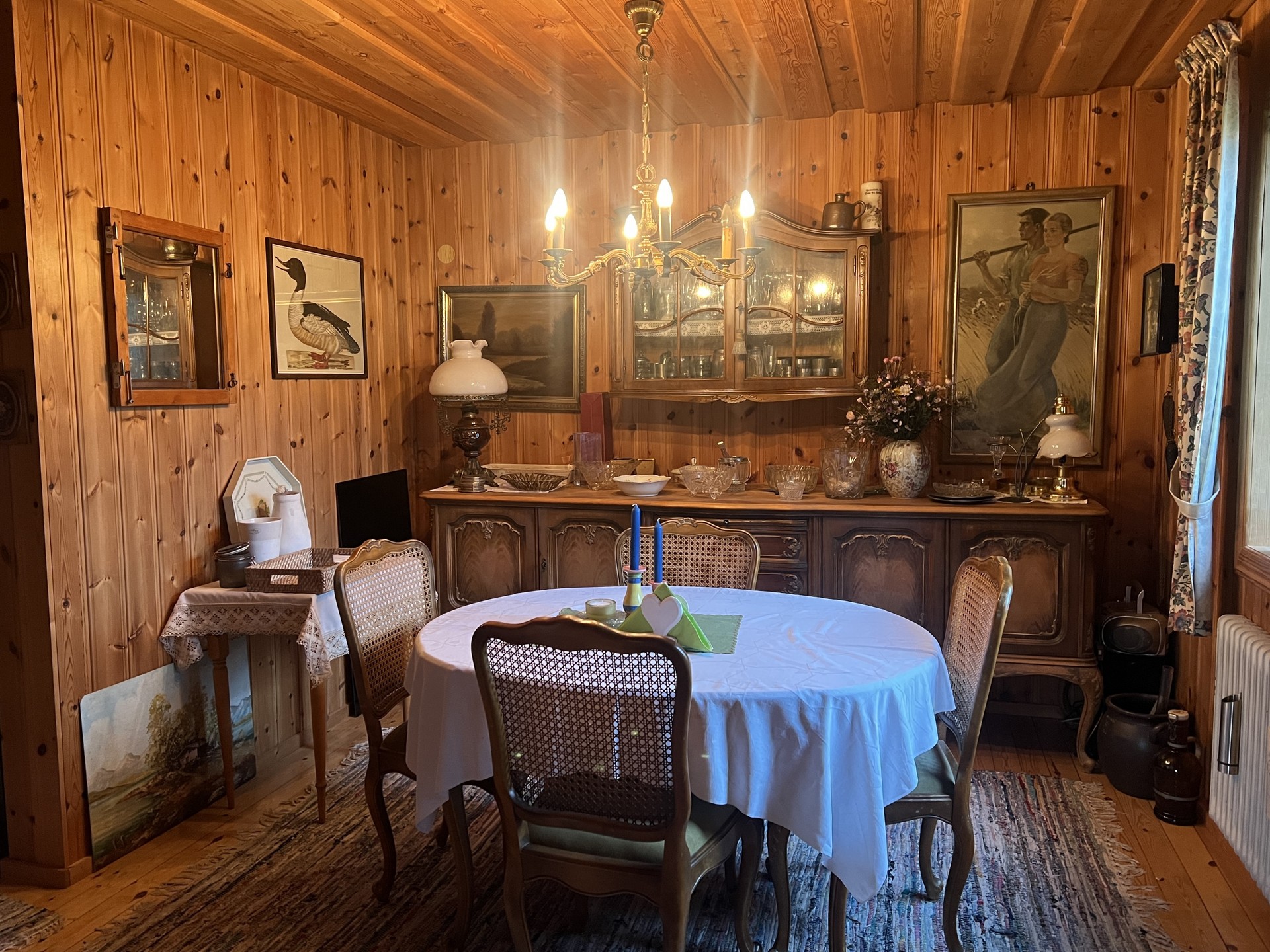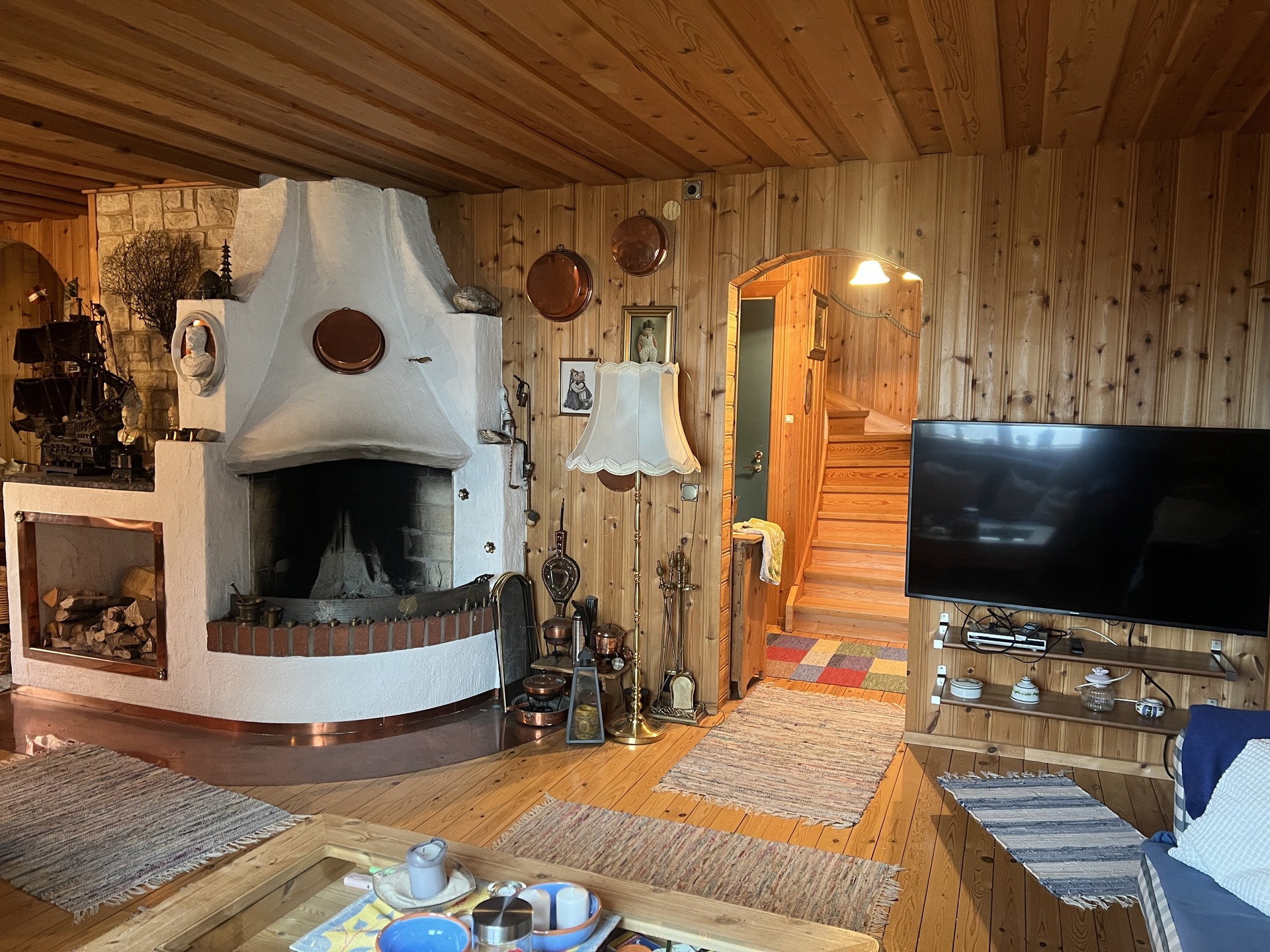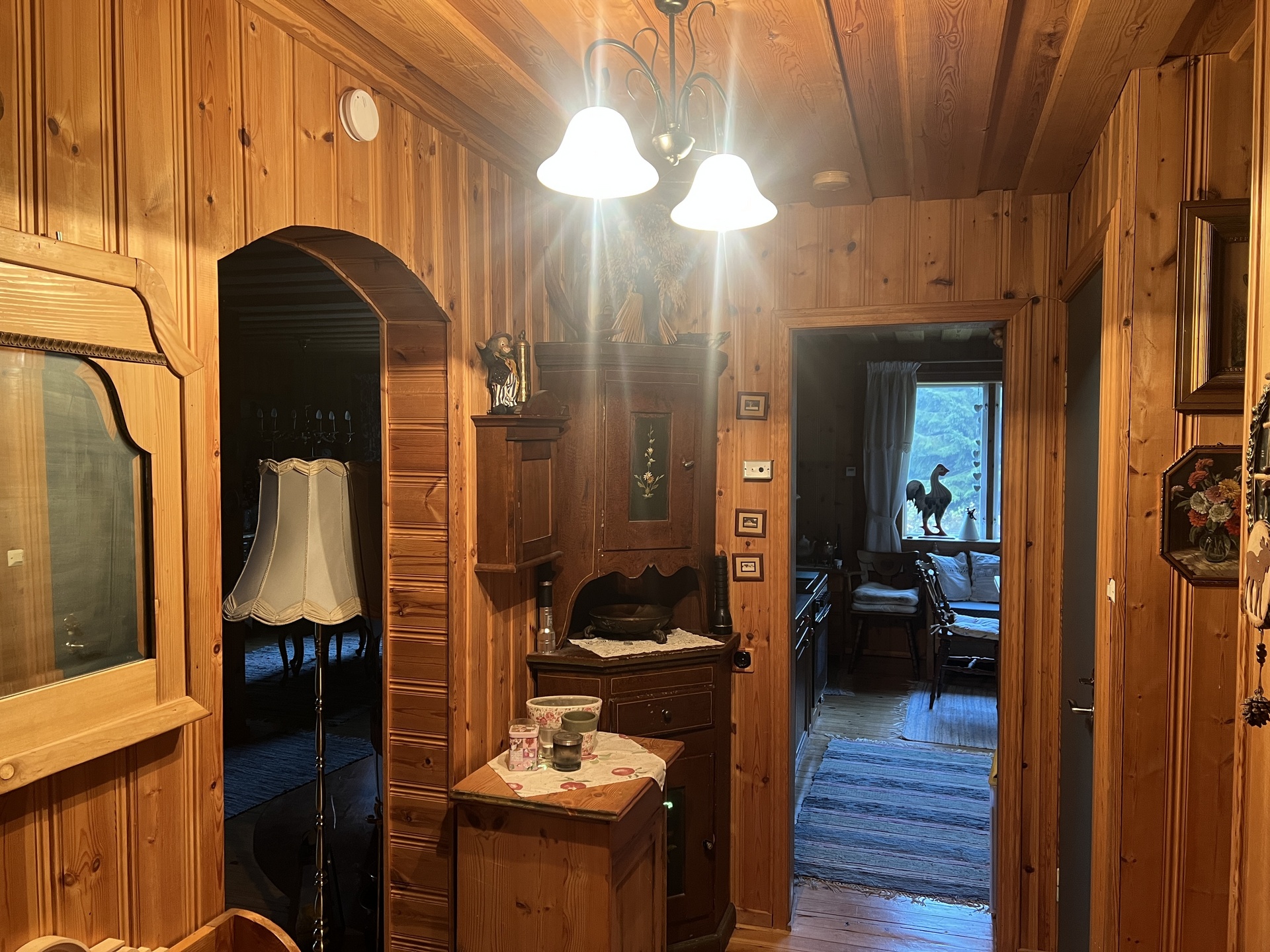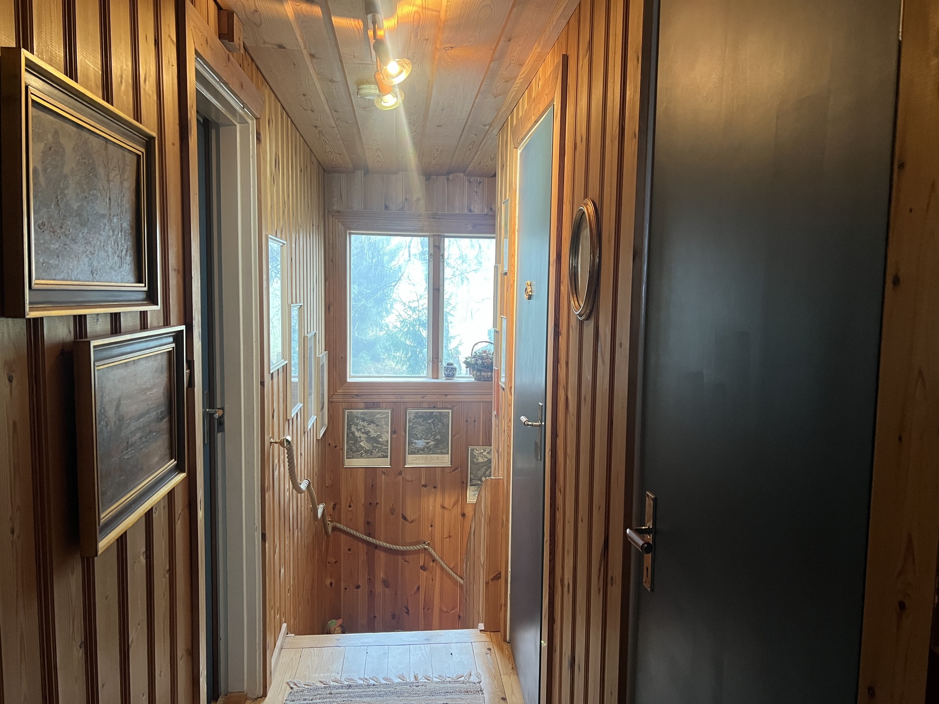 Rumsbeskrivning: Nedre plan: Genomgående trägolv, panel på väggarna och i taket