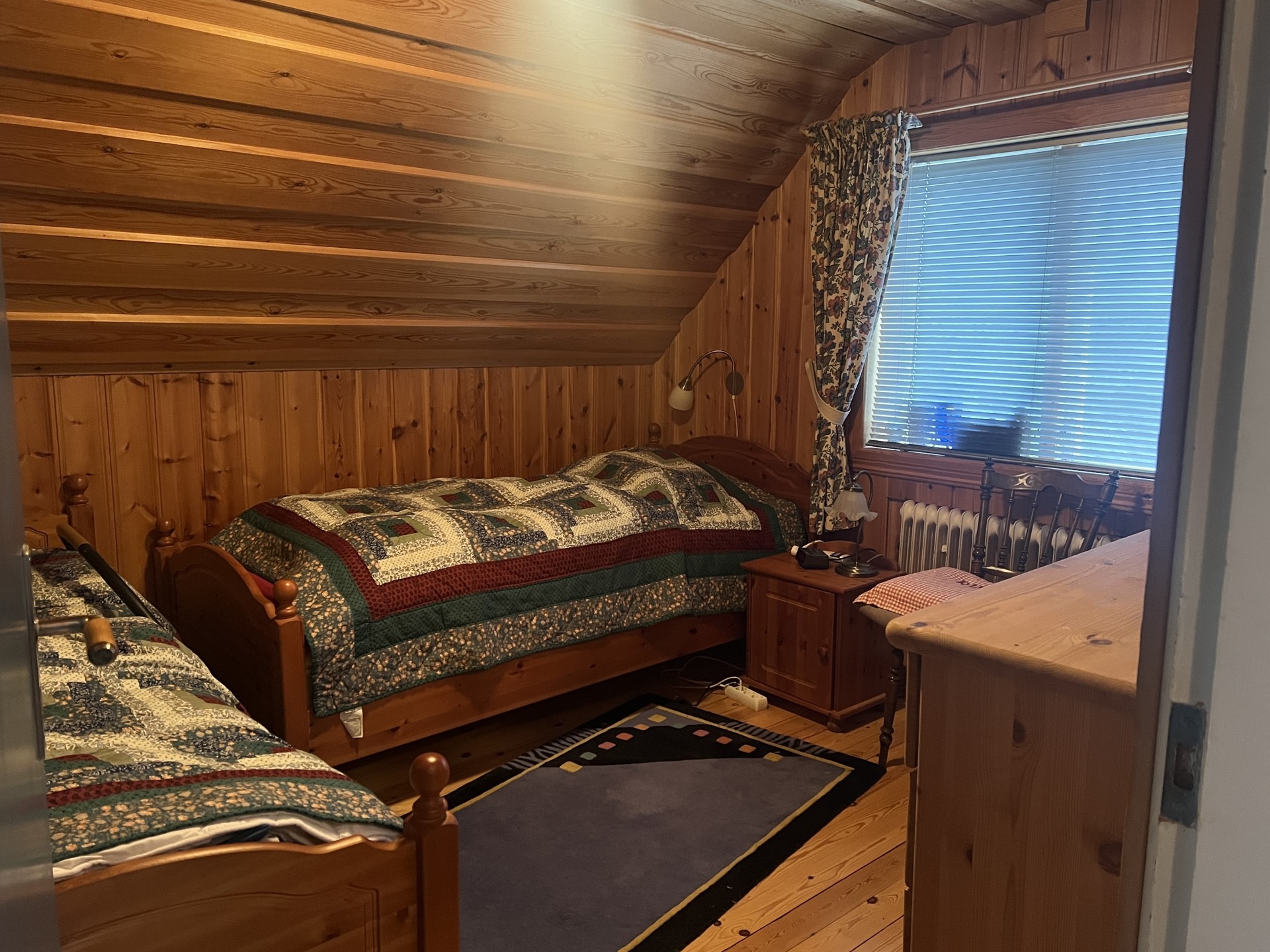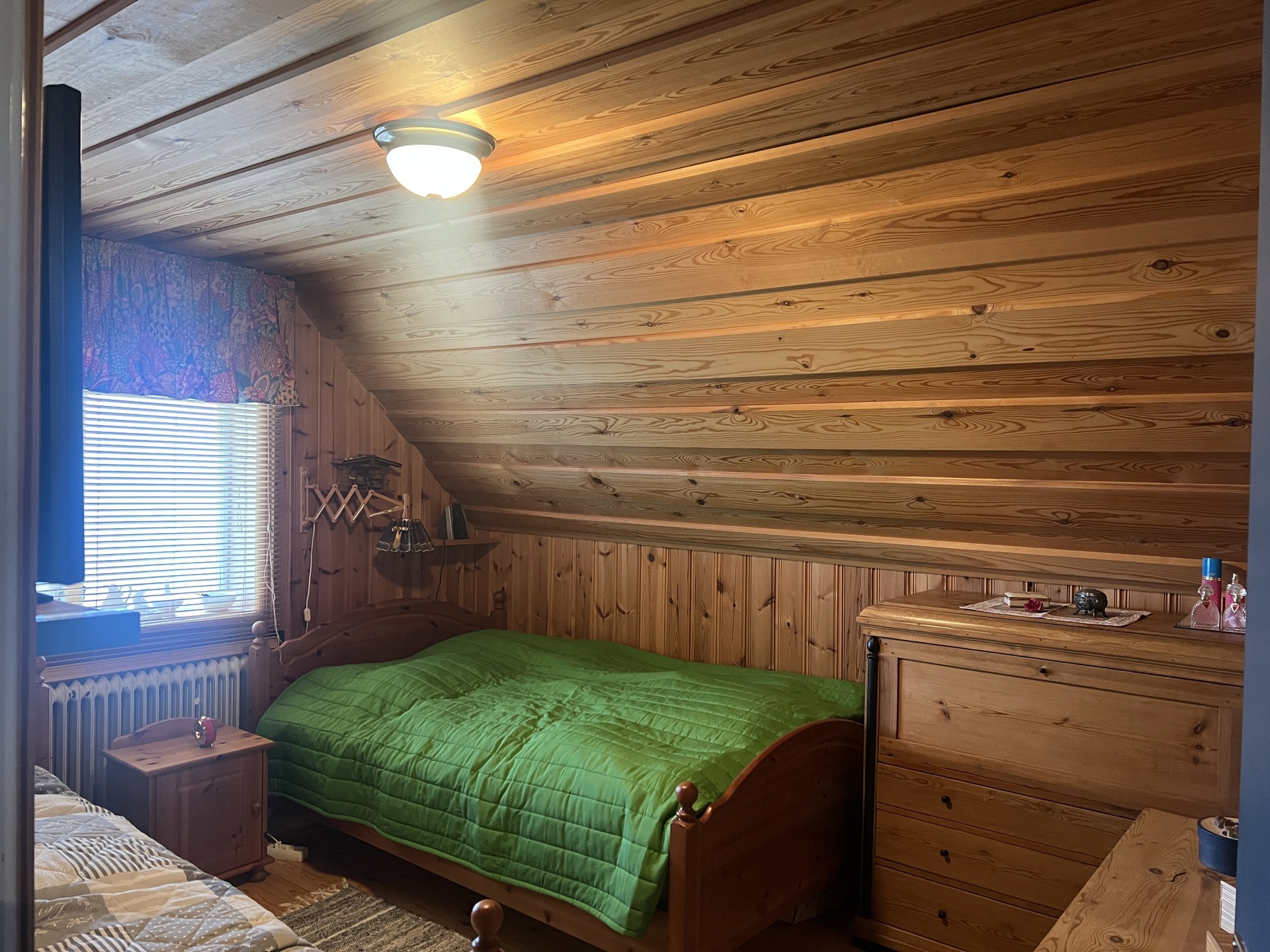 Sovrum 2: Trägolv, panel väggar och taket, fönster åt ett håll. Snedtak, inbyggd garderob