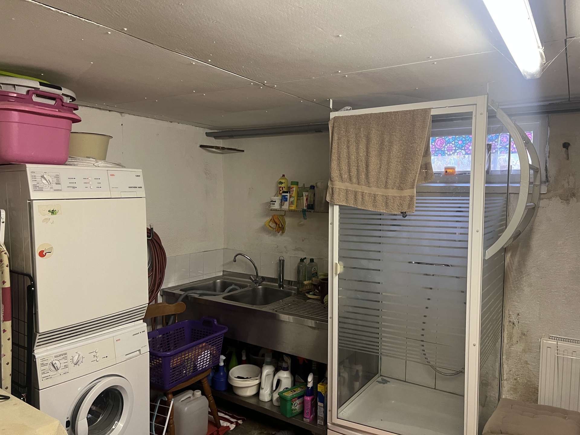 Tvättstuga: tvättmaskin och torktumlare, rostfri vask, duschkabin, spis och slaktrum.