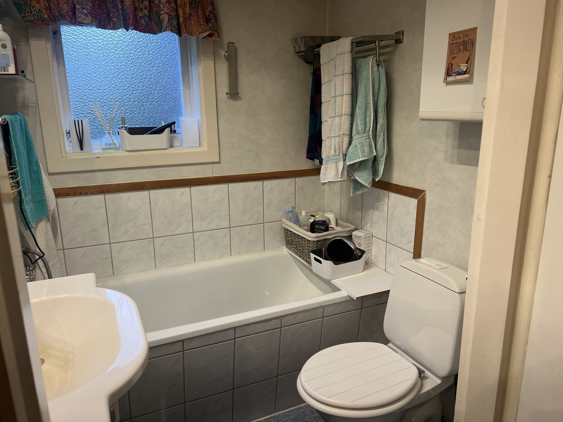 - Badrum: Klinkergolv, badkar, handfat, WC, kakel / plastmatta väggarna och ett öppningsbart fönster
