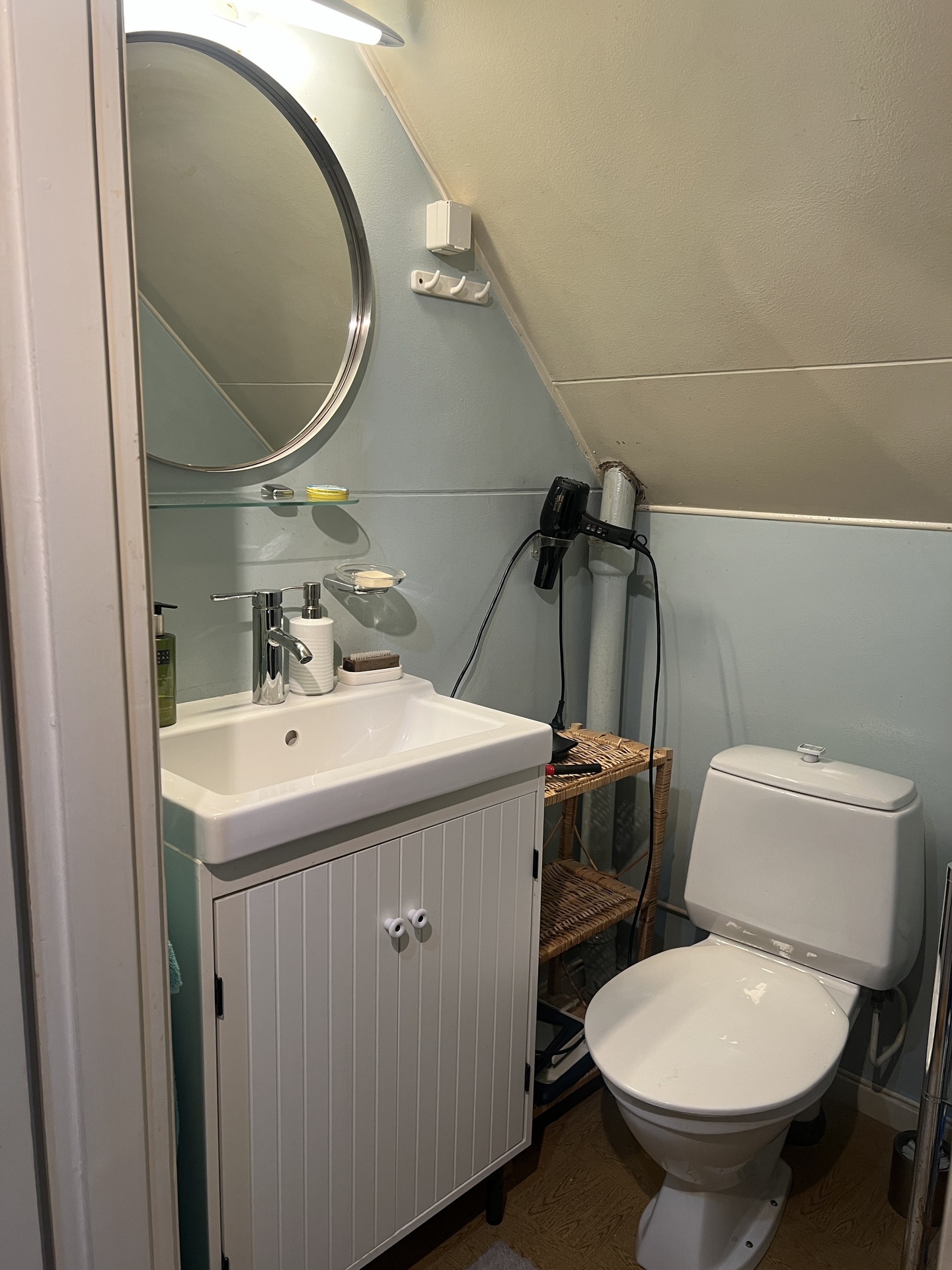 WC: Snedtak, handfat med underskåp, WC, målad masonit väggar och tak