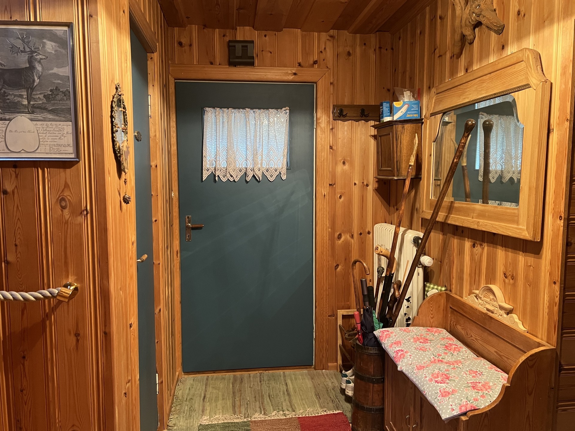 Hall: Trägolv, panel på väggarna och i taket. Från hallen når man WC, garderob samt de 3 sovrummen