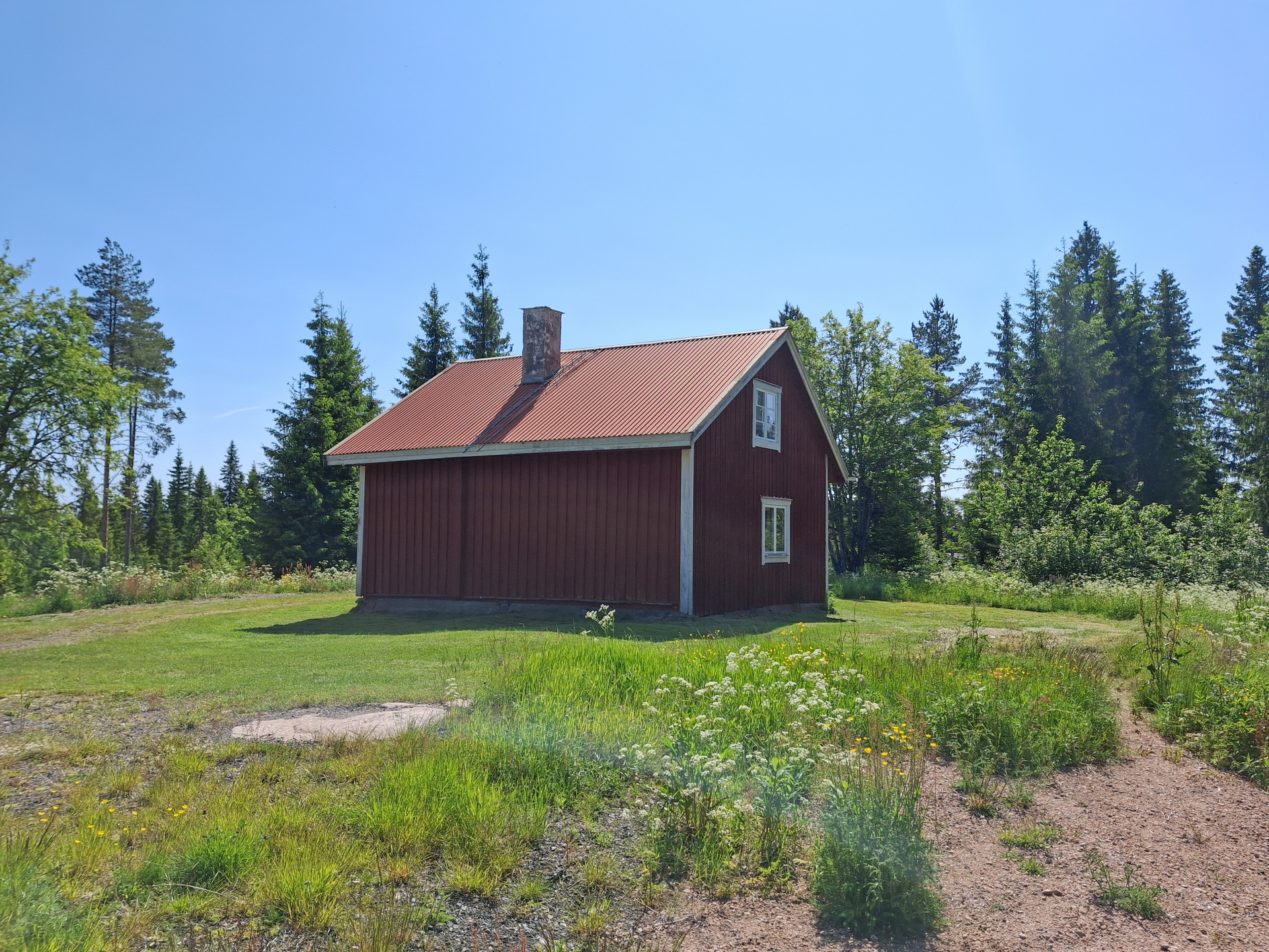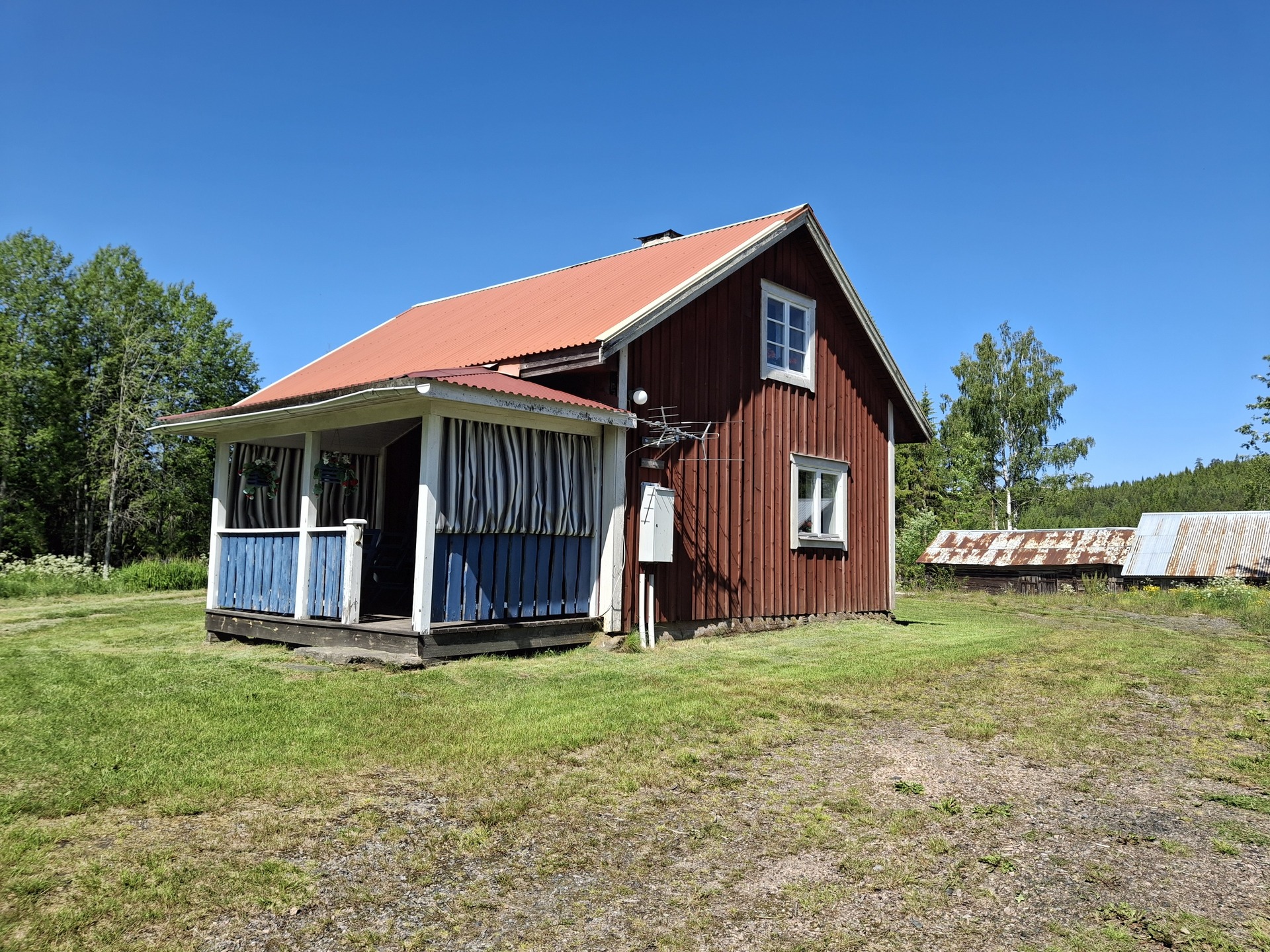 På 90-talet byggdes ny veranda samt övervåningen inreddes med tak, väggar och golv - Byggnadssätt: Fönster: Kopplade fönster, delvis med spröjs. Skorstenstyp: Murad skorsten med enklare huv. Avlopp: Enkelt avlopp för gråvatten. Vatten: Grävd brunn, sommarvatten. Taktyp/takbeklädnad: Plåt. Grund: Huggen sten. Stomme: Trä. Fasadtyp: Stående träpanel med läkt. Bjälklag: Trä.